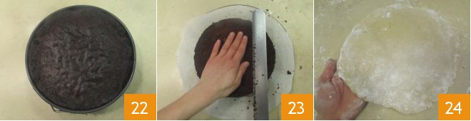 Once the cake baking time is over, take it out of the oven and let it cool in the mold 22, then gently unmold it and trim the surface using a serrated knife 23. At this point, you can take the marzipan dough from the refrigerator: dust the work surface with powdered sugar and roll out one of the dough portions to form a circle with an 8-inch diameter 34.