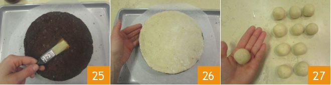 Transfer the cake onto a baking sheet lined with parchment paper and brush the surface with apricot jam that you previously heated 25, then place the marzipan disc on top 26. Take the second marzipan portion and make 11 balls 27.