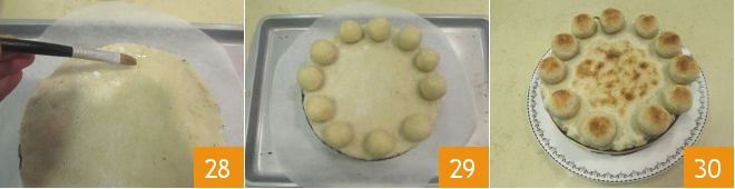 Brush the marzipan disc with water where you will place the balls 28 and position them along the edge of the cake 29. Finally, set the oven to grill mode and place the cake on the middle rack for about 5 minutes, ensuring that the marzipan does not burn but only darkens slightly. Your simnel cake is ready to be served 30!