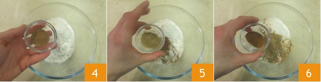 Mix the dry ingredients in a separate bowl: sift the flour with the baking powder, then add the nutmeg 4, ginger 5, and cinnamon 6.