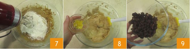 Add the dry ingredients to the butter, sugar, and egg mixture and combine everything with the electric whisk 7. At this point, add the lemon zest 8, raisins 9,
