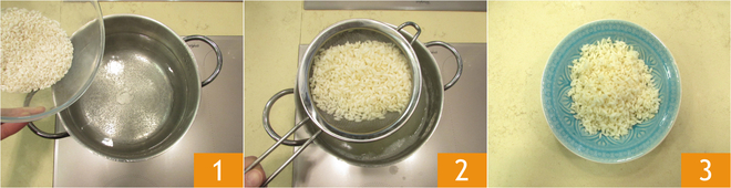 To prepare the vegetarian hosomaki, start by cooking the original rice. Rinse it under cold running water and boil it in salted water for 9 minutes. 1. Drain the rice 2 and season it with rice vinegar, then let it cool to room temperature 3.