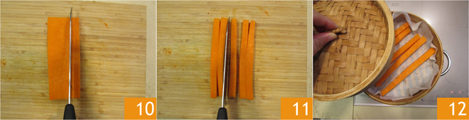 Meanwhile, cut the pumpkin to obtain 4 rectangles 8 inches long and about 0.4 inches wide and high 10 11. Place the pumpkin rectangles in the same steamer and let them cook for 7 minutes 12.
