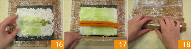 Place 4 leek leaves over the entire surface of the rice 16 and then place 2 pumpkin rectangles in the center 17. Now roll your hosomaki starting from the bottom, squeezing it well with your hands until the roll is well compact 18.