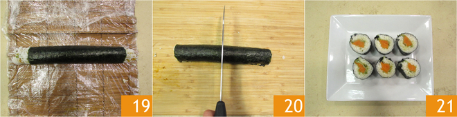 At this point 19 transfer it to a cutting board and cut it first in half and then into 6 pieces 20. Your vegetarian hosomaki is ready to be served, if you like, with some soy sauce 21.