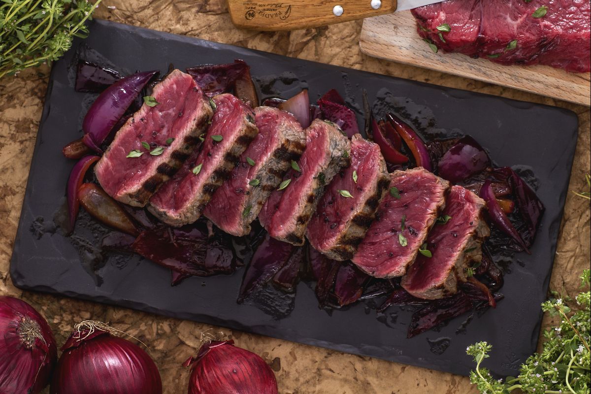 Form a layer of caramelized onions on a serving plate 19 and place the sliced beef on top 20. Garnish with more Hawaiian black salt and thyme leaves 21 and serve your sliced beef with sweet and sour onions immediately!