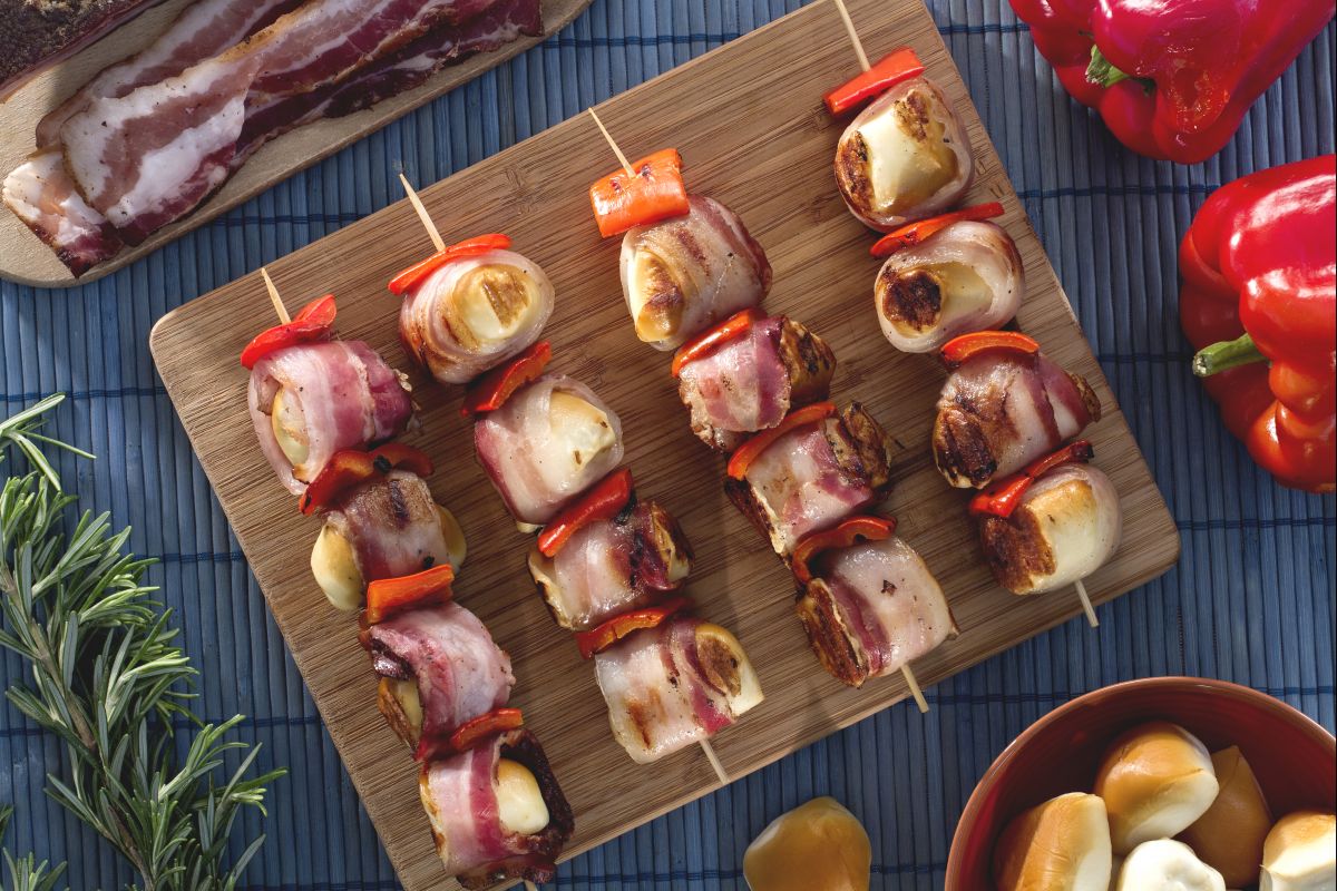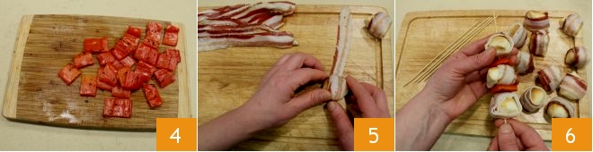 Cut the roasted pepper into 16 squares of about 1 inch on each side and set them aside for a moment 4. Wrap the smoked scamorza bites with slices of bacon (one for each bite) 5, then using a long skewer, pierce one bite, then a piece of pepper 6 and continue alternating the ingredients.