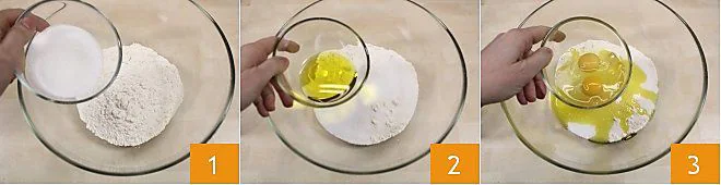 To prepare the Abruzzo soffioni, remember to place the sheep's ricotta in a fine mesh strainer and let it drain for at least 2 hours to release its whey. Then, proceed with the dough preparation: take a large bowl and add the flour, then add the sugar 1, the oil 2, and the eggs plus the yolk 3.