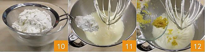 At this point, sieve the ricotta you had set to drain, using the back of a spoon 10, and add it to the frothy mixture 11. Finally, add the grated lemon zest you set aside 12, mix, and transfer everything to a bowl. Remember not to mix for too long, otherwise, you will whip the ricotta.