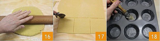 Now roll out the dough until it reaches a thickness of about 1/8 inch 16. Divide the sheet into 12 squares, measuring 4x4 inches 17, and butter a muffin tin using a brush 18. If you don't have a muffin tin, you can use disposable aluminum molds found in all supermarkets.