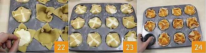 After buttering the tin, lightly dust it with flour 19, and start placing the dough squares into the spaces, ensuring to leave the edges out 20. Then, pour about 1/4 cup of cream into each dough square 21.