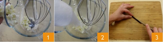 To prepare the cocoa cake with chocolate ganache, add the room temperature softened butter cut into pieces 1 along with the sugar 2 in a stand mixer with whisks. Slice the vanilla bean lengthwise and scrape out the seeds with a knife 3.