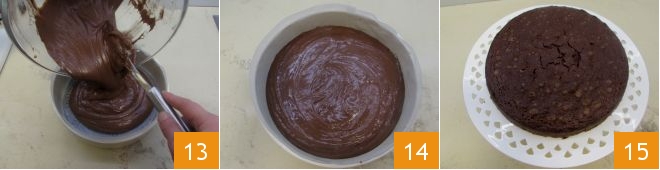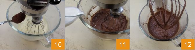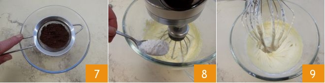 Also gradually add the cocoa 10 and finally pour in the room temperature milk 11; blend all the ingredients well until you get a dense and homogeneous dough 12.