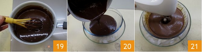 Once the chocolate has melted 19, transfer the mixture to a bowl containing ice 20 and start whipping with an electric mixer 21 (you can partially cover the container with plastic wrap to avoid splashes).