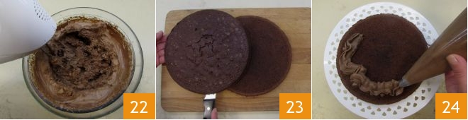 Work the ganache for 10-15 minutes until whipped 22, then transfer it to a piping bag with a star nozzle that you will place in the refrigerator. When the cake has completely cooled, cut it in half 23 and fill the base disc with part of the chocolate ganache you prepared 34;