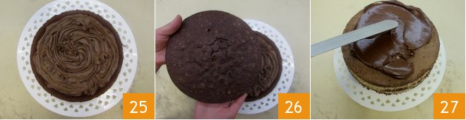 After filling the base 25, place the top disc 26. With the remaining ganache, cover the cake 27, spreading it with a spatula over the entire surface to make it smooth.