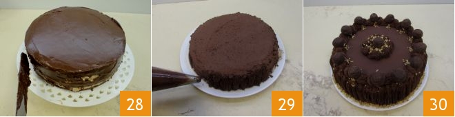Cover the sides of the cake well 28 and with the remaining ganache, make the final decorations: make vertical squirts on the sides 29 and then small tufts on the squirts, along the entire perimeter of the cake and in the center. Sprinkle the hazelnut grains every two tufts and the base, finally placing the dark chocolate truffles: your cocoa cake with chocolate ganache is ready to be served and enjoyed 30!