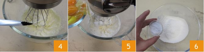 Start the whisks until you get a light and fluffy cream. Add the vanilla bean seeds 4 and the whole eggs plus 1 room temperature yolk one at a time, waiting for the previous one to be absorbed before adding the next, continuing to whip 5. In a separate bowl, sift the flour, baking powder 6, and