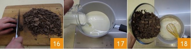 Meanwhile, prepare the chocolate ganache. Chop the dark chocolate 16, then heat a saucepan with the cream 17. When the cream almost reaches a boil, turn off the heat and pour in the chopped chocolate, stirring with the whisks to completely melt it 18.