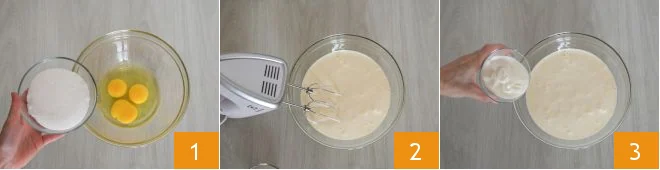 To prepare the soft coconut and chocolate cake, first break the eggs into a bowl. Then add the sugar 1 and beat everything with electric whisks until you get a fluffy and frothy consistency 2. At this point, add the yogurt 3