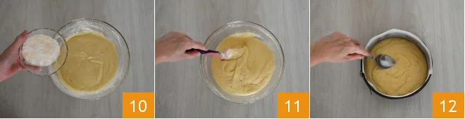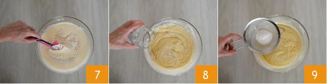 mix again gently from bottom to top with the spatula 7. Add the water 8 and the sifted baking powder 9. Mix again without deflating the mixture.