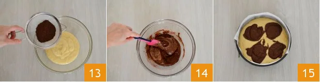 Sift the cocoa into the remaining batter 13 and mix to absorb it 14. Use a spoon to transfer it into the pan, creating 4 mounds 15.