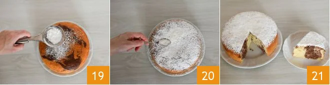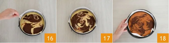Using a long skewer, create the typical marbled effect (16-17). Then bake in a preheated static oven at 350°F for 40 minutes. Once cooked, take the cake out 18 and let it cool before removing it from the pan.