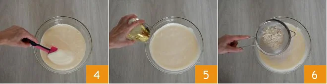 and gently mix with a spatula 4. Then add the vegetable oil 5 and mix again. Then sift the all-purpose flour inside 6,