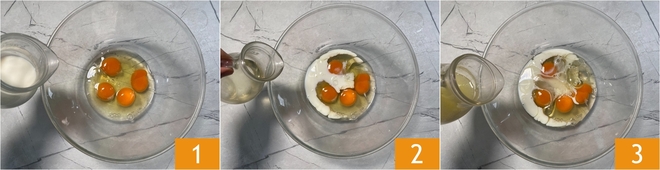 To prepare the soft lemon fritters, start with the dough. Combine eggs, milk 1, seed oil 2, and lemon juice 3 in a large bowl.