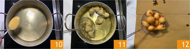 In a large pot, heat the seed oil to 320°F. Shape the fritters by sliding a tablespoon of dough 10 into the oil; use another spoon to help slide the dough. Fry them for 3-4 minutes, turning them with a slotted spoon until golden 11. Drain the soft lemon fritters on paper towels for frying 12.