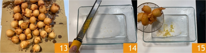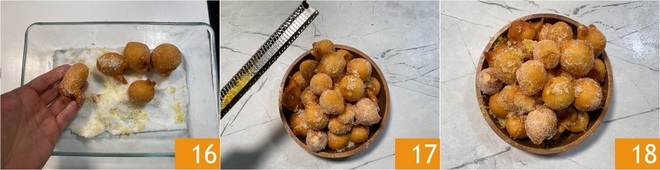 Continue in this way until the dough is finished 13, you will get about 40. Meanwhile, in another bowl, mix the sugar and more grated lemon zest 14, then add some still-warm fritters inside 15.