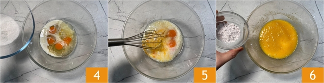 Then add the sugar 4 and mix with a whisk 5. Add the baking powder 6.