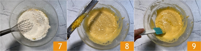 Add the flour and mix well 7 until you get a smooth and creamy mixture. Flavor with the grated zest of one lemon 8 and mix with a spatula 9 to incorporate it.