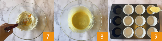 cornstarch 4, baking powder, milk, oil, and lemon juice 5, then the eggs 6.