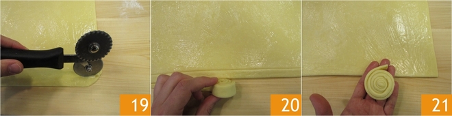 Now, using a pastry cutter and a ruler, cut strips about 2 cm wide 19. Roll each strip 20 to form a roll 21.