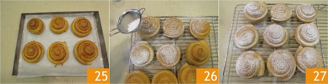 Bake in a preheated static oven at 350°F for about 25 minutes. When they are nicely golden, remove your soft sweet rolls from the oven 25, let them cool slightly, and dust with powdered sugar 26 before serving them 27.