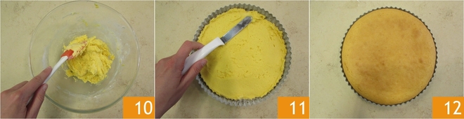 Once you have obtained a dense and homogeneous dough 10, pour it into a 9-inch smart mold, previously buttered, and level it with an offset spatula 11. Bake in a preheated static oven at 350°F for about 25 minutes. Once ready, remove the tart from the oven and let it cool at room temperature 12.