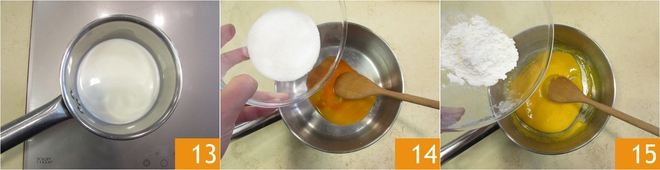 While the tart is baking, you can prepare the cream: pour the milk into a saucepan and bring it to a near boil 13. Meanwhile, in another saucepan, place the egg yolks and sugar 13. Mix well with a wooden spoon and add the starch 15. Stir again until obtaining a homogeneous mixture, without incorporating air.