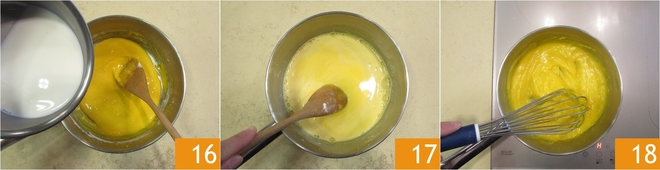 As soon as the milk starts to boil, pour a small amount into the egg mixture 16 and stir. Then, add the rest of the milk and stir again 17. Return to the heat and, stirring with a whisk, cook until the cream thickens and almost reaches a boil again 18.
