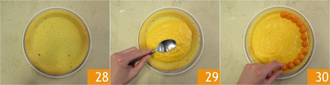 Now, invert the tart base onto a plate so that the cavity is facing up 28. Pour the cream inside and level it 29. Now take the melon balls and place them around the edge on just half of the tart 30.
