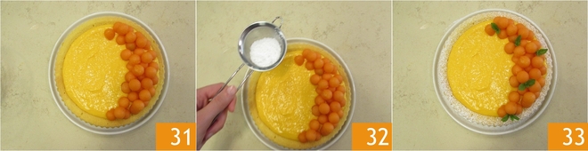 Then add the rest to form a half-moon shape 31 and sprinkle powdered sugar on the edge of the soft tart 32. Decorate with mint leaves and serve 33.