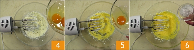 Add the first egg 4 and work with the electric mixer until well absorbed. Then add the second egg and mix until fully combined. Now add the baking powder 6.
