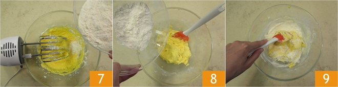 At this point, add a portion of the flour 7 and mix again with the electric mixer 7. Then, add the remaining flour 8 and mix with a spatula 9.