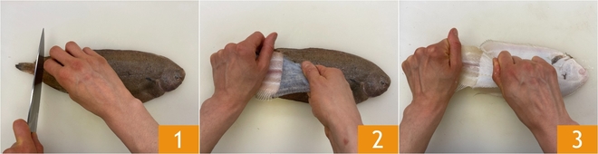To prepare sole meunière, first clean the sole: with a knife, cut into the skin at the tail 1, then peel it off by grasping it firmly and pulling it towards the head 2. Do the same to remove the white skin 3.