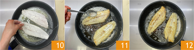 When the butter is melted, place the soles in the pan 10 and cook for 4-5 minutes on each side, basting them with the cooking juices, and turning them gently 11. Once cooked 12, transfer the soles to a plate, leaving the cooking juices in the pan.