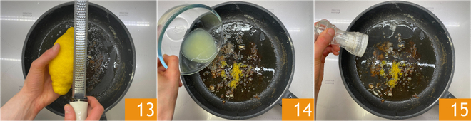 Add the lemon zest 13 and juice 14 to the cooking juices, then season with salt 15.