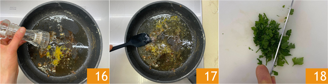 Season with a grind of pepper 16 and emulsify with the heat off to create a sauce 17. Finely chop the parsley 18.