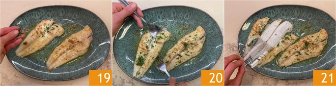 Sprinkle the soles with the chopped parsley 19, then gently remove the fillets 20 and discard the bones 21.
