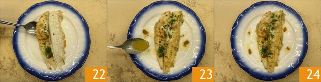 Finally, place the fillets on a serving plate 22 and drizzle with the prepared sauce 23. Your sole meunière is ready to be served 34!