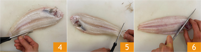 With kitchen scissors, remove the lateral bones 4 and the tail 5. Finally, make an incision just below the head 6 and remove the entrails, then cut it off. Quickly rinse the soles under running water and pat them dry with paper towels.